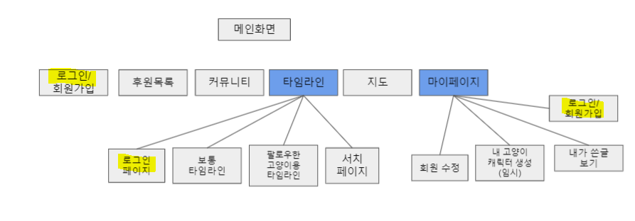 다들 플로우 차트 작성이 서툴어서 그런지는 몰라도 화면에서 이동할 수 있는 페이지들을 모두 표시하다보니