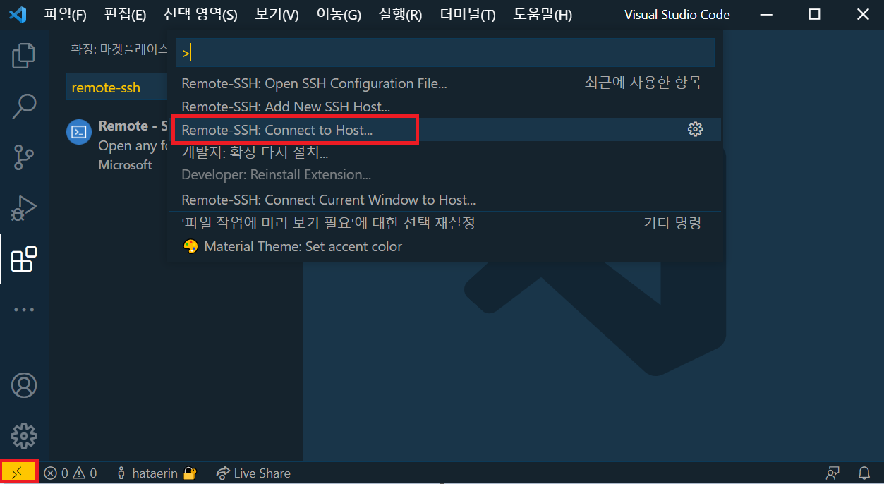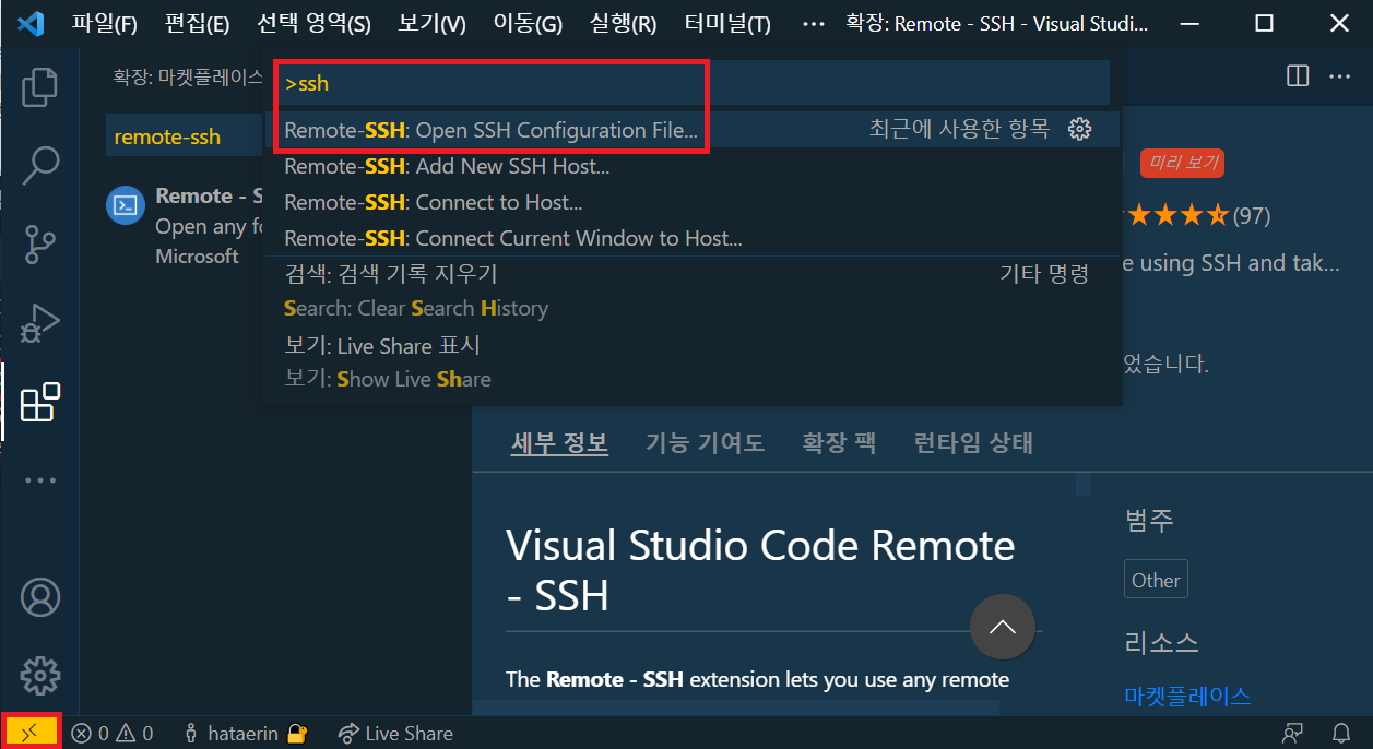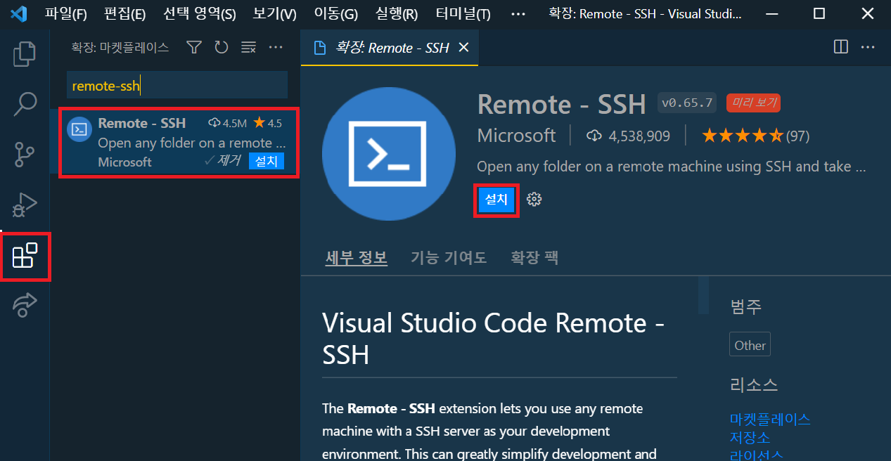 1) 왼쪽 확장탭에서 Remote-ssh를 검색하여 설치한다
