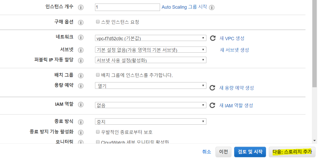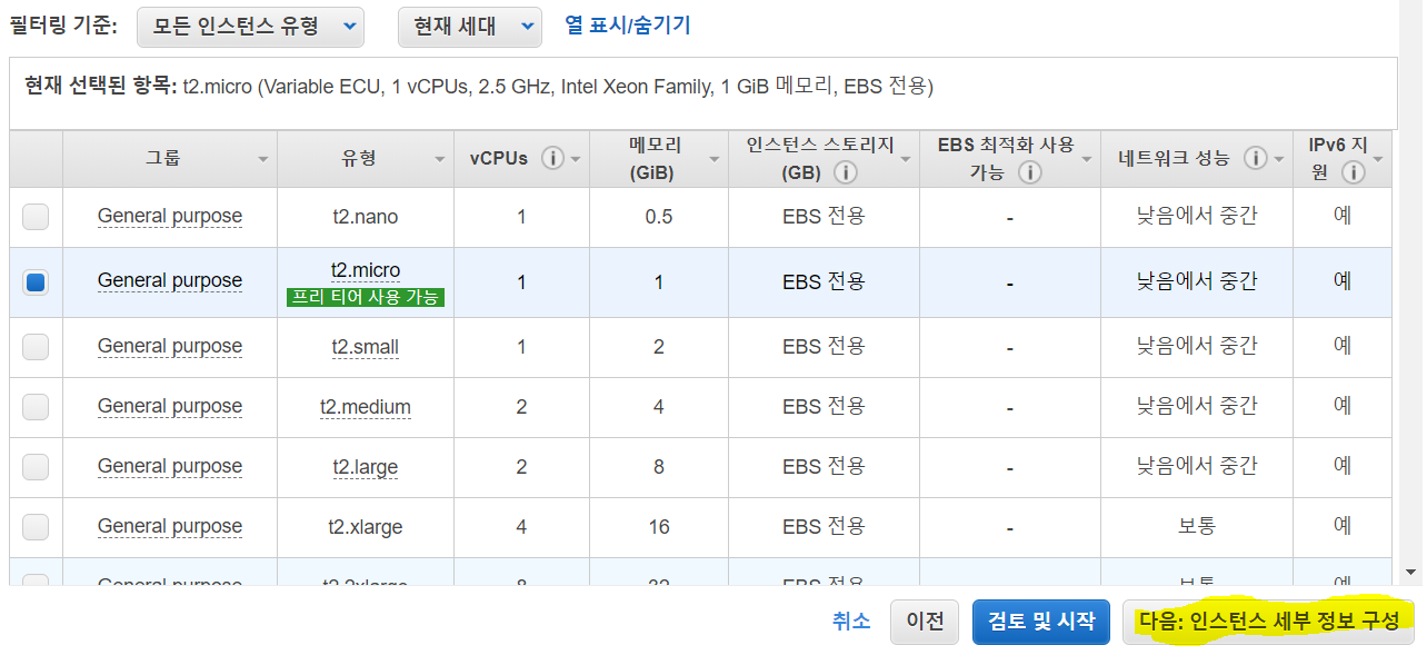 t2.micro를 선택하고 다음버튼을 클릭한다. (파란버튼아님)