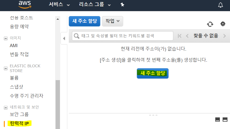 탄력적IP에 들어가서 새주소를 할당받는다.