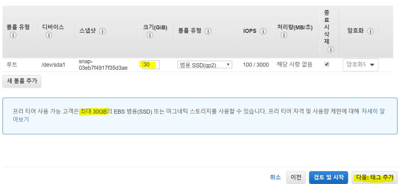 프리티어는 30GB까지 무료이다. 스토리지 크기 변경후 다음버튼 클릭