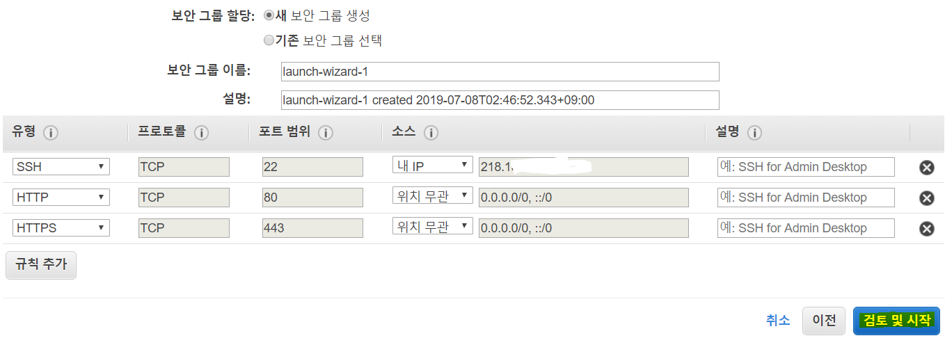 일반 사용자들이 접근해야하는 HTTP(S)는 IP위치 무관으로 설정하고 보안을 위해 22번포트는 내 IP로 설정하도록 한다.